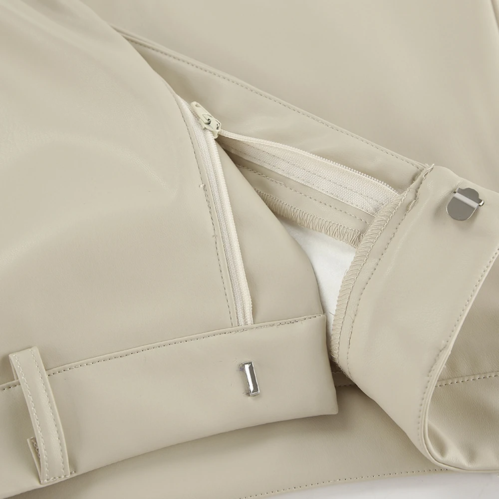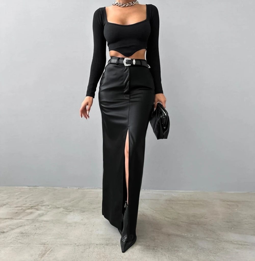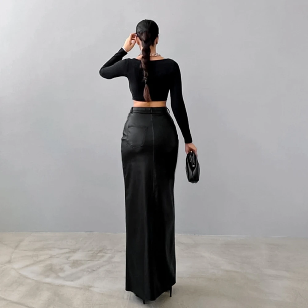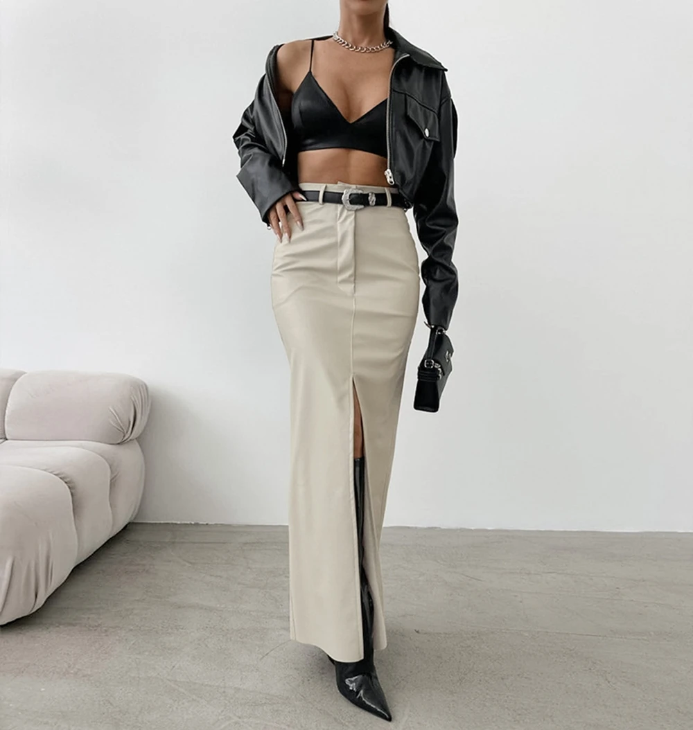 2024 European And American Style Fashionable PU Leather Solid Color Splicing Design Sense High Waist Slit Slim Fit Long Skirt