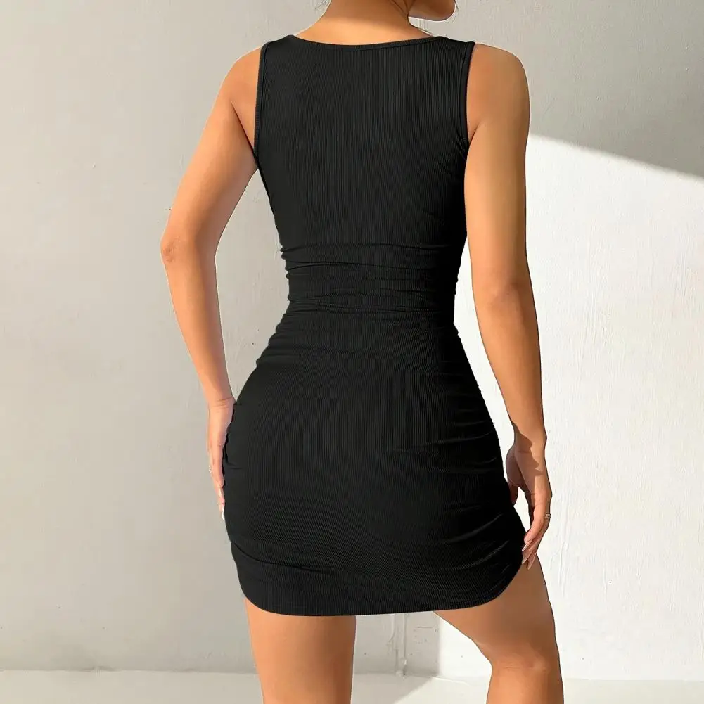 Women Mini Dress Pleated Sleeveless Sheath Dress Slim Fit Square Neck Thread Pure Color Elastic Vest Dress for Club Beach Parties