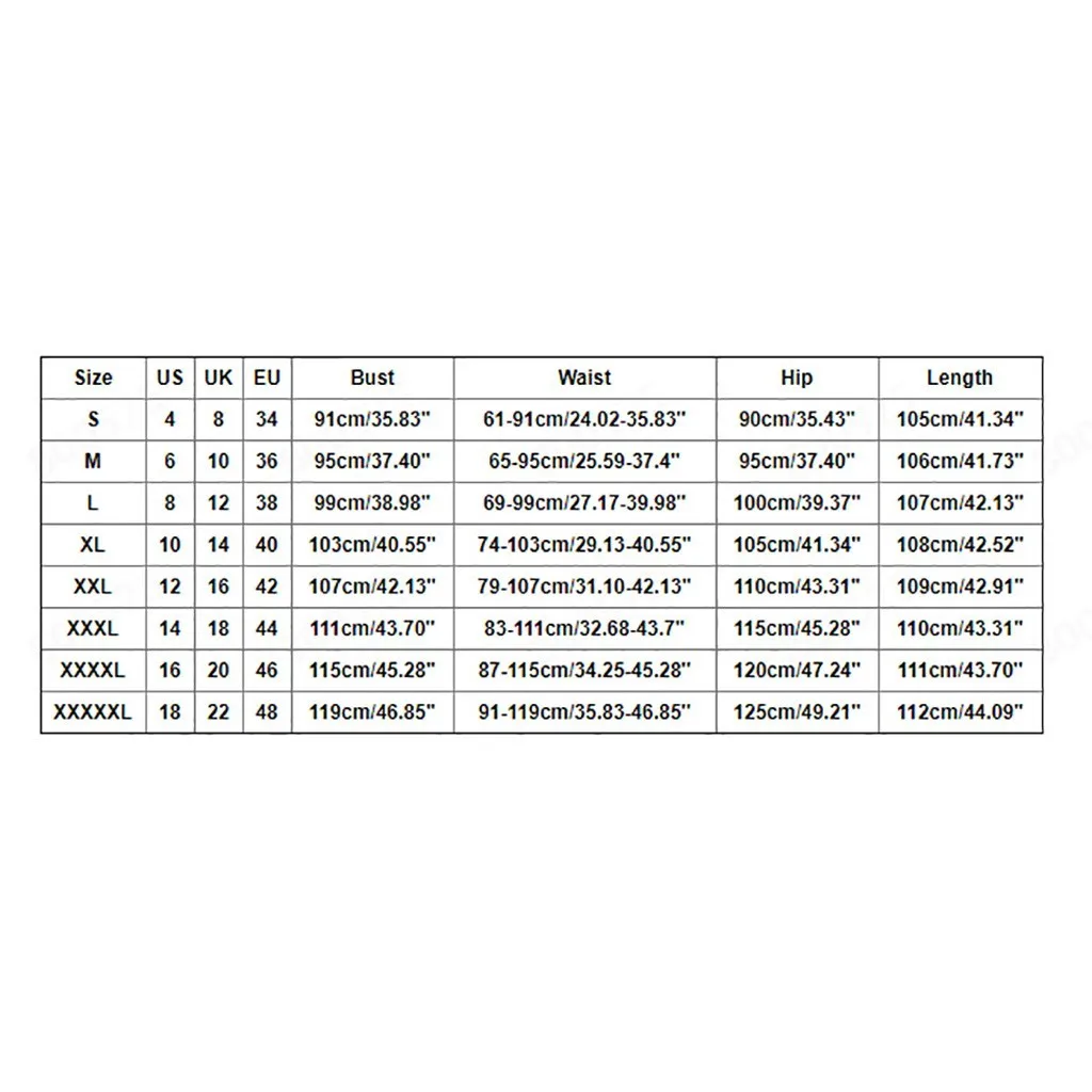 | Size:XXXXL | US:16 | UK:20 | EU:46 | Bust:115cm/45.28” | Waist:87-115cm/34.25-45.28” | Hip:120cm/47.24” | Length:111cm/43.70” |