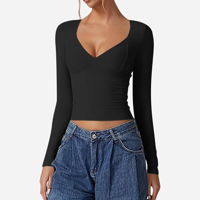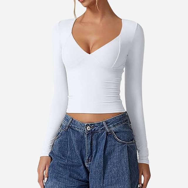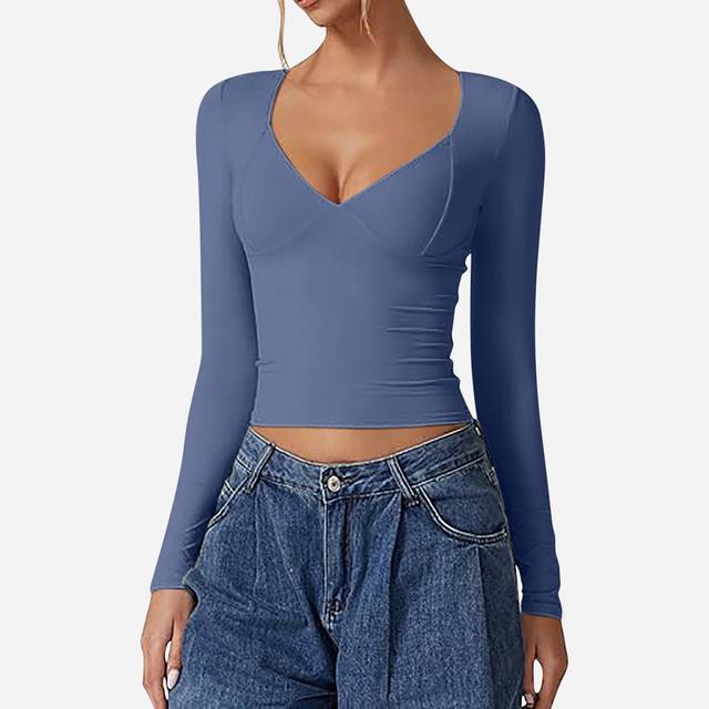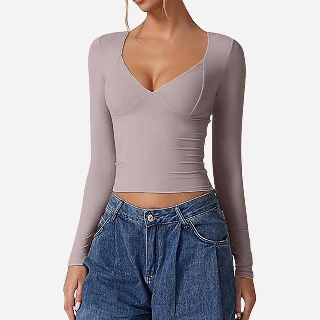 Women’s Long Sleeve V Neck T Shirts Double Lined Crop Top Seamed Cup Going Out Tops Fall Outfits Fashion Clothes